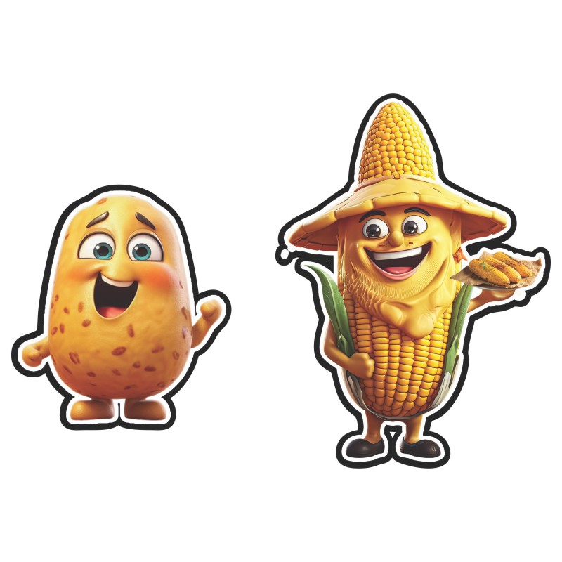 وکتور کاراکتر کارتونی سیب زمینی و ذرت | طرح فانتزی مواد غذایی